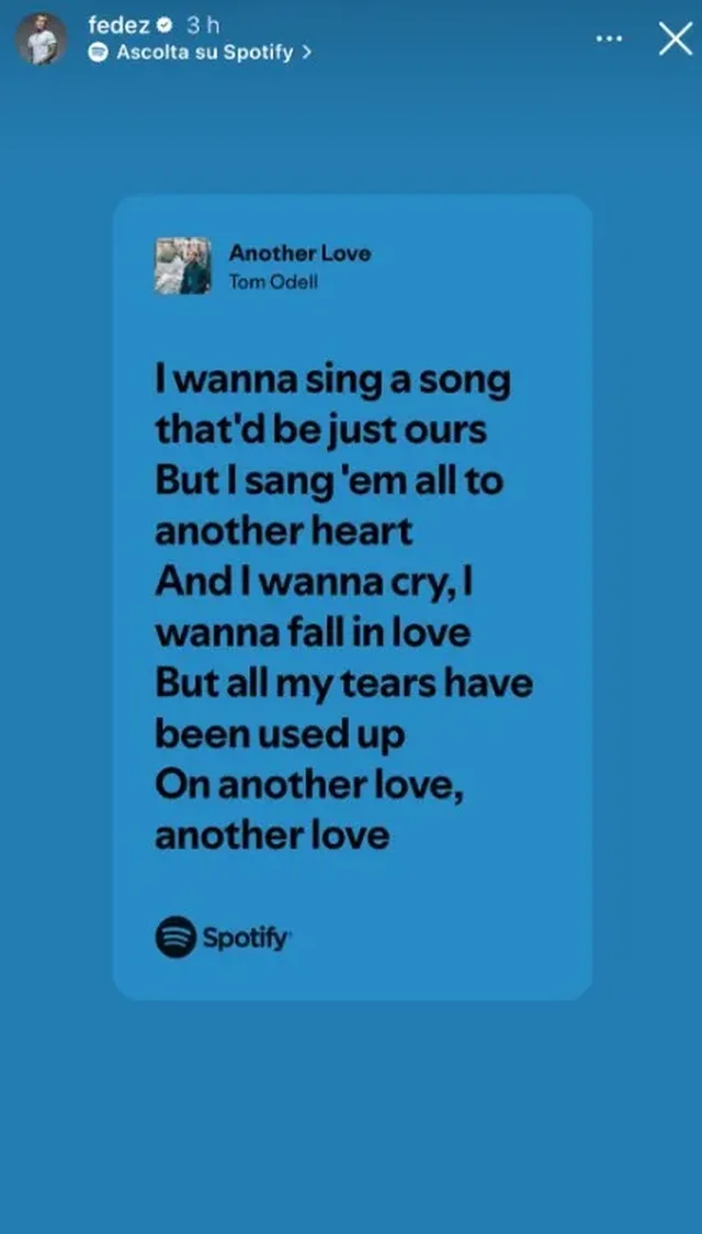 Në një seri storiesh në Instagram, Fedez ka habitur ndjekësit e tij me një ton të papritur melankolik, duke ndarë vargje nga kënga “Another Love” e Tom Odell dhe disa reflektime personale që duken si pjesë të një kënge të tij të re.