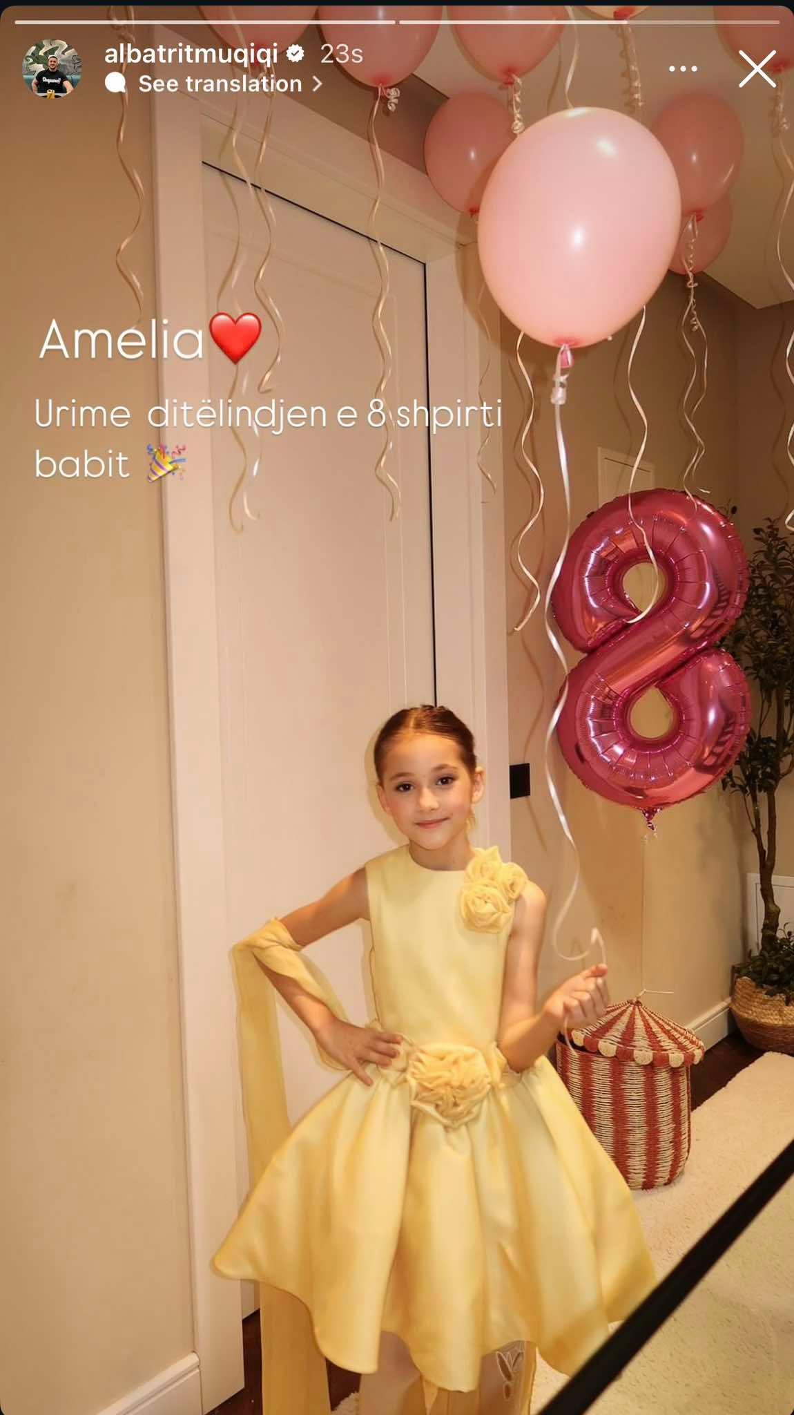 Përkrah tullumbaces së madhe në formën e numrit 8, Amelia ka pozuar me vetëbesim dhe buzëqeshje, duke reflektuar gëzimin e ditës së saj të veçantë. Ndjekësit dhe fansat kanë reaguar me komente të shumta urimi, duke e përgëzuar këngëtarin për vajzën dhe për dashurinë që rrezaton në këtë moment të rëndësishëm familjar.