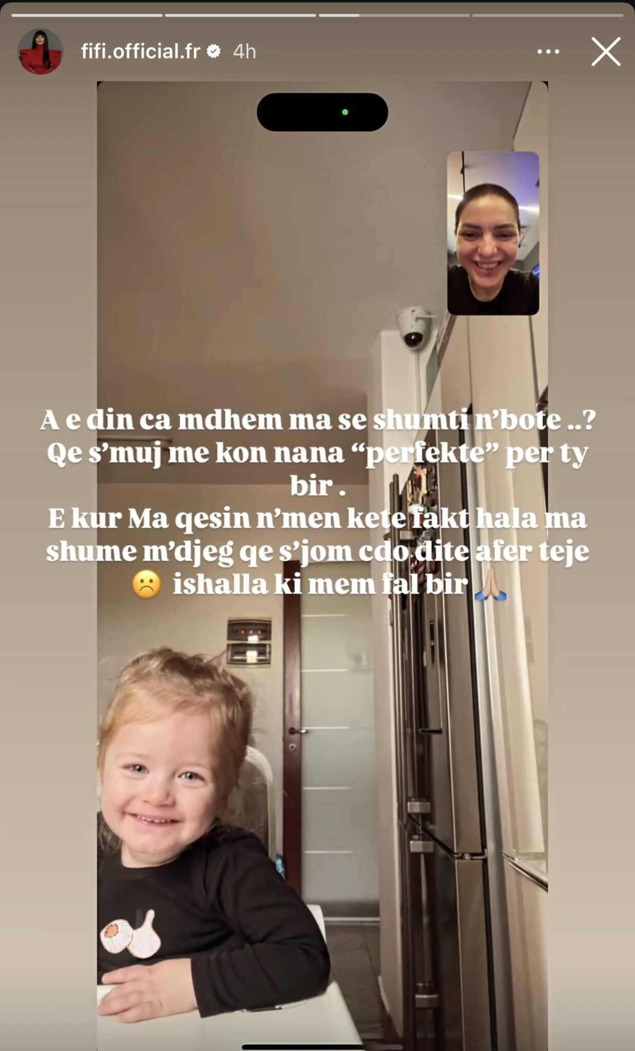 Me anë të një Instastory, Fifi ka thënë se gjëja që i dhemb më së shumti në botë është fakti që nuk mund të jetë nëna më perfekte në botë. Kur publiku ia vë në pah këtë gjë, duket se Fifit i dhemb edhe më shumë, sepse nuk ka mundësi të jetë pranë djalit çdo ditë.