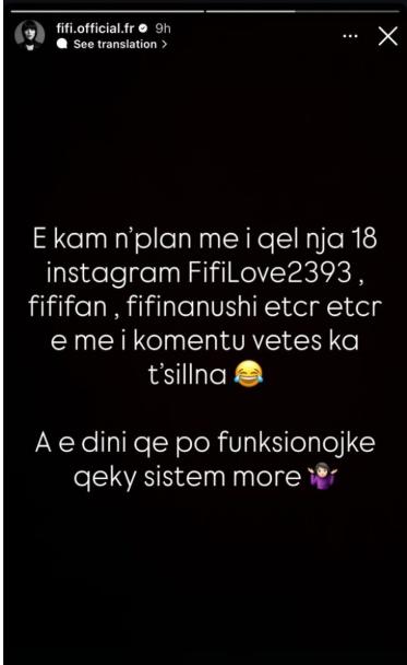 “E kam n’plan me i qel nja 18 Instagram FifiLove2393, Fififan, Fifinanushi etj. etj., e me i komentu vetes ka t’sillna. A e dini që po funksionojke qiky sistem more?”