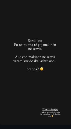 Më pas ai postoi një tjetër foto me shkrimin: “Sardi iku, po nxitoj tha të çoj makinën në servis. Ai e çon makinën në servis vetëm kur do ikë jashtë ose brenda?!”.