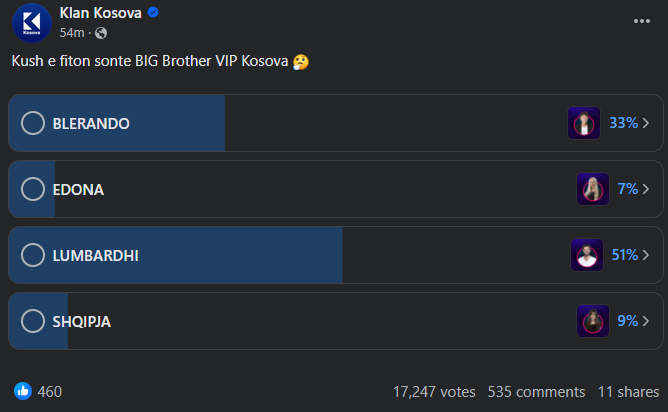 Në një sondazh të hapur në Facebook nga Big Brother VIP Kosova, konkurrent i cili po prinë në këtë sondazh është Lumbardhi, i cili nga 17.247 vota ka grumbulluar 51%.