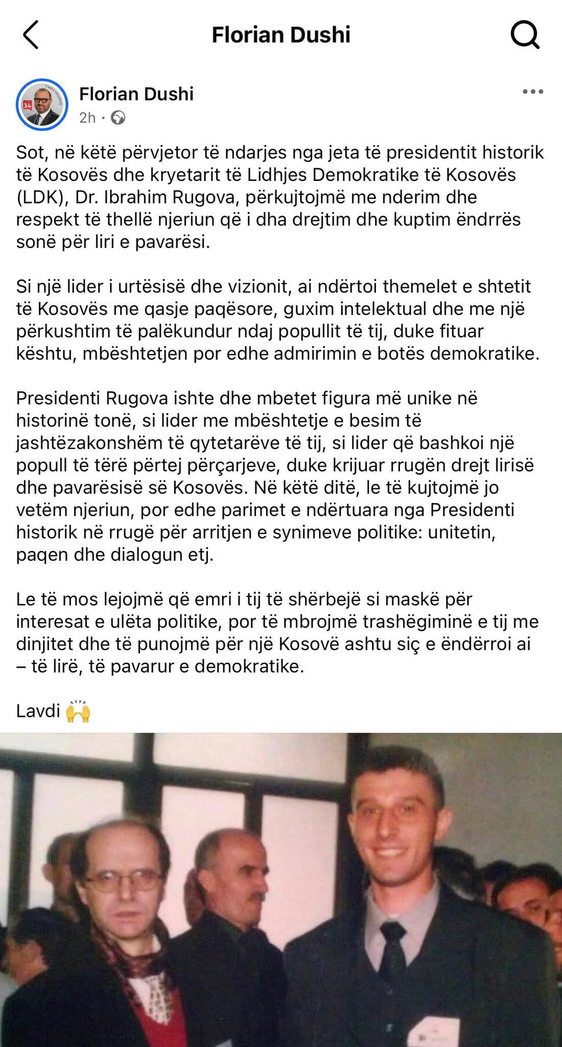 Dushi, shkruan: “Sot, në këtë përvjetor të ndarjes nga jeta të presidentit historik të Kosovës dhe kryetarit të Lidhjes Demokratike të Kosovës (LDK), Dr. Ibrahim Rugova, përkujtojmë me nderim dhe respekt të thellë njeriun që i dha drejtim dhe kuptim ëndrrës sonë për liri e pavarësi.
