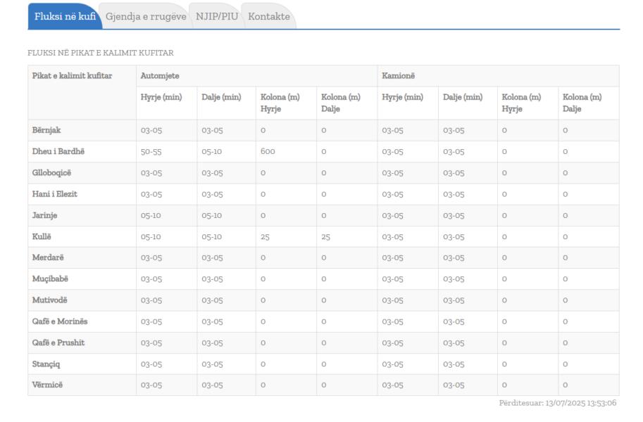Sipas përditësimit të fundit të Qendrës Kombëtare për Menaxhim Kufitar vetëm te ”Dheu i Bardhë” pritjet janë për rreth 1 orë, ndërsa në pikat tjera kufitare nuk ka kolona të gjata.