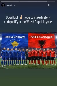 Këngëtarja shqiptare me famë ndërkombëtare, Rita Ora, ka treguar mbështetjen e saj për kombëtaren e Kosovës dhe të Shqipërisë në futboll përmes një postimi në Instagram.