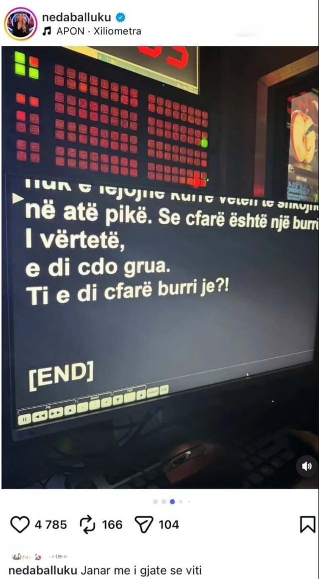 Teksti i shfaqur në ekran ne foton qe ajo ka publikuar në Instagram dhe më pas e ka fshirë, ishin rreshtat: “Se çfarë është një burrë i vërtetë e di çdo grua. Ti çfarë burri je”?