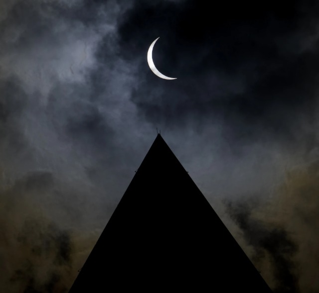 Hëna shihet duke kaluar para diellit me majën e Monumentit të Uashingtonit në siluetë gjatë një eklipsi diellor në Uashington