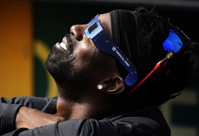 Andrew McCutchen i Pittsburgh Pirates shikon eklipsin diellor përpara një loje bejsbolli kundër Detroit Tigers në Pittsburgh