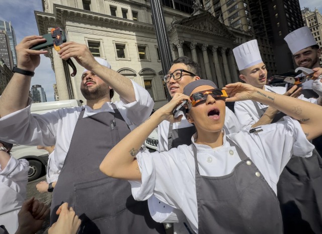 Punëtorët e restorantit në lagjen Flatiron të Manhatanit bëjnë një pushim për të parë eklipsin diellor