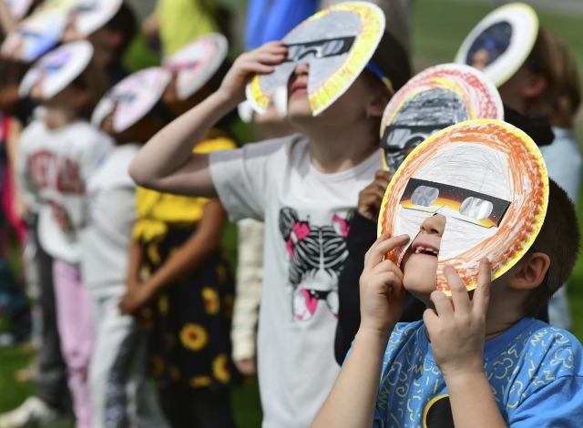 Issace Hutchison, 8 vjeç, nxënës i klasës së dytë të shkollës fillore të Ferndale Area, shikon eklipsin diellor përmes syzeve të tij mbrojtëse të dekoruara speciale me shokët e klasës në shkollën në Johnstown