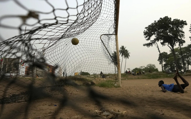 Një i ri shikon topin pasi zhytet ndërsa luan futboll në një fushë me pluhur në Abidjan, Bregu i Fildishtë