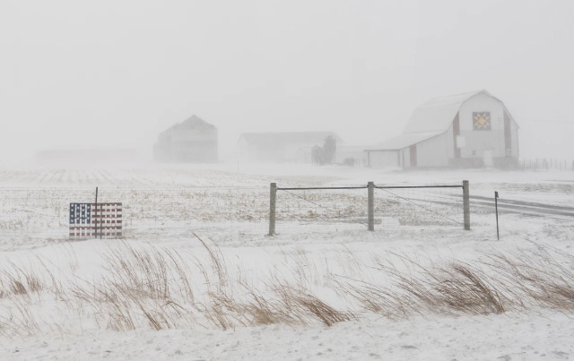 Një flamur amerikan është montuar në një gardh në një fermë në autostradën amerikane gjatë një stuhie dëbore