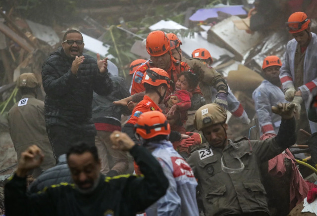 Personeli i urgjencës mban një vajzë 4-vjeçare, e cila u shpëtua nga shtëpia e saj e shembur pas shirave të dendur në Petropolis, shteti Rio de Janeiro, Brazil