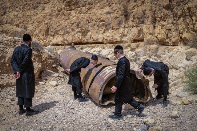 Hebrenjtë ultra-ortodoksë shikojnë një pjesë të një rakete balistike të kapur që ra në shkretëtirë pranë qytetit të Arad, Izrael