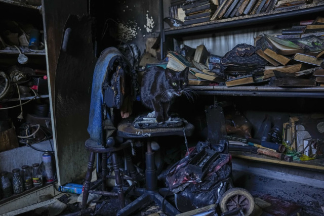 Një mace kërkon ushqim në një shtëpi të djegur nga raketat e Hezbollahut në qytetin Kiryat Shmona, në veri të Izraelit, pranë kufirit me Libanin