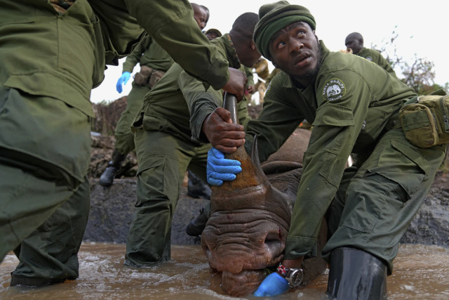 Rojtarët e Shërbimit të Kafshëve të Egra Kenia dhe ekipi i kapjes tërheqin një rinoceront të zi të qetësuar nga uji në Parkun Kombëtar të Nairobit
