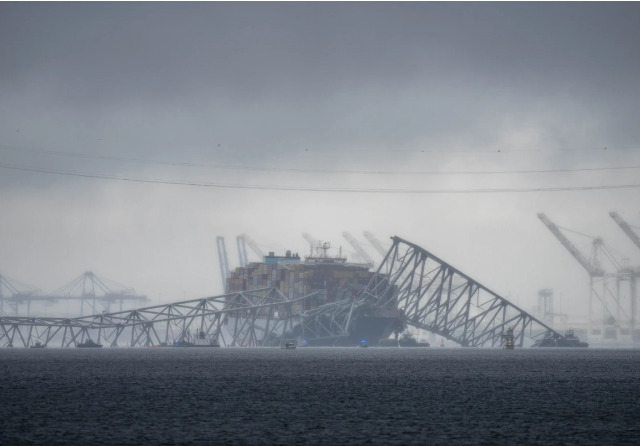 Anija e kontejnerëve Dali qëndron përballë rrënojave të urës Francis Scott Key të Baltimores në lumin Patapsco