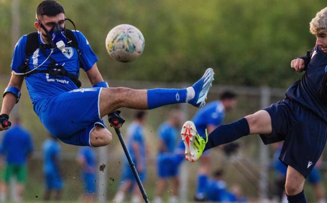 I veshur me një pajisje që mat konsumin e tij të energjisë, lojtari i Ekipit të Futbollit të Izraelit të Amputuar, Ben Maman, i majtë, lufton për topin me një futbollist të ri nga një ekip lokal gjatë një seance praktike në Ramat Gan, Izrael