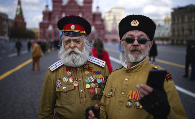 Dy burra me uniforma ruse kozake pozojnë për një selfie me Muzeun Historik në sfond pasi vizituan mauzoleumin e themeluesit sovjetik Vladimir Lenin