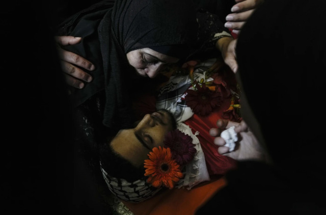 Nëna e Ahmed Nidal Aslan, i cili u vra gjatë përleshjeve me forcat izraelite, vajton mbi trupin e tij gjatë funeralit të tij në kampin e refugjatëve të Bregut Perëndimor të Qalandiya