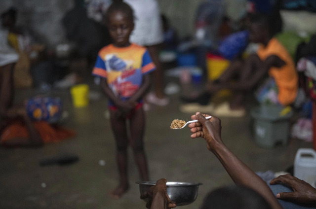Një nënë e shtyn vajzën e saj të provojë një lugë oriz në një shkollë të kthyer në një strehë të improvizuar për njerëzit e zhvendosur nga dhuna e bandave, në Port-au-Prince, Haiti
