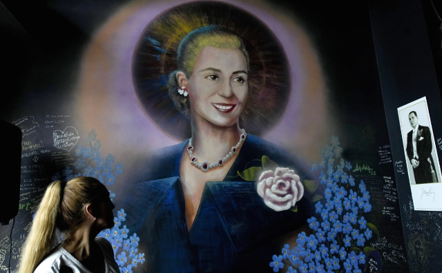 Një mural i ish-zonjës së parë argjentinase María Eva Duarte de Perón, e njohur më mirë si Eva Perón, ose Evita, që e përshkruan atë me aureolën e një shenjtori, zbukuron një mur brenda restorantit Peron Peron në lagjen San Telmo të Buenos Aires, Argjentinë