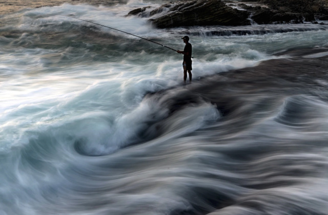 Një peshkatar hedh vijën e tij të peshkimit në Detin Mesdhe nga një zonë shkëmbore përgjatë vijës bregdetare në Bejrut, Liban