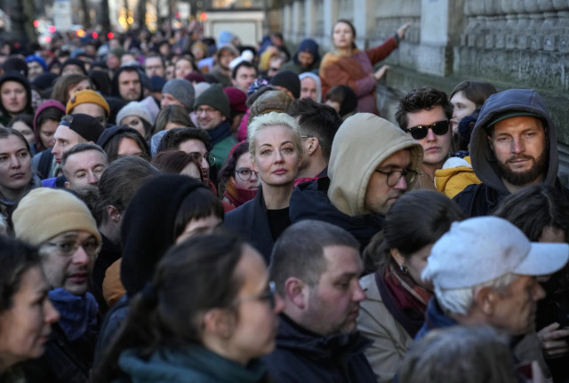 Yulia Navalnaya, qendra, e veja e Alexey Navalny, qëndron në një radhë me votuesit e tjerë në një qendër votimi pranë ambasadës ruse në Berlin