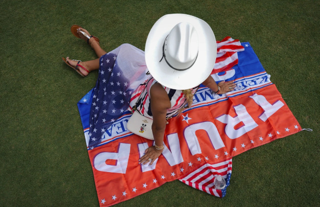 Një mbështetës i ish-presidentit të kandidatit republikan për president Donald Trump pret fillimin e tubimit të fushatës së tij në Doral, Fla