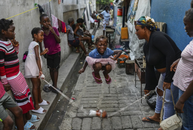 Një vajzë luan një lojë me litar në një shkollë ku banojnë banorë të zhvendosur nga dhuna e bandave në Port-au-Prince, Haiti