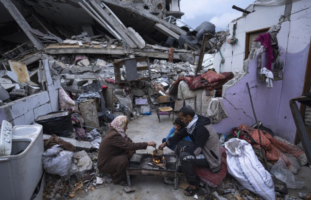 Anëtarët e familjes Al-Rabaya e ndërpresin agjërimin gjatë muajit të shenjtë mysliman të Ramazanit jashtë shtëpisë së tyre, e cila u shkatërrua nga një sulm ajror izraelit, në Rafah, Rripi i Gazës