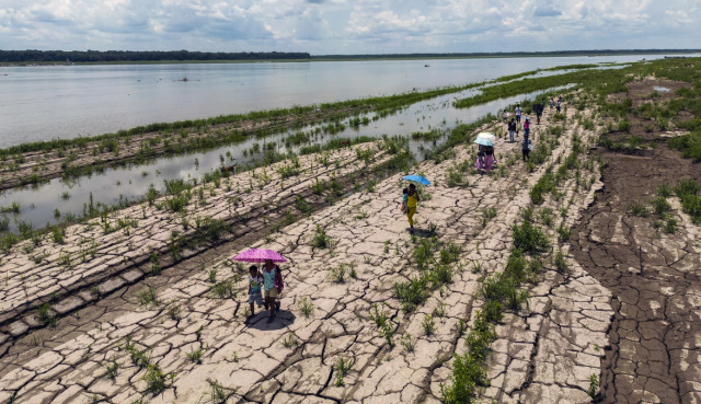 Njerëzit ecin nëpër një pjesë të lumit Amazon që tregon shenja thatësire në Santa Sofia, në periferi të Leticia, Kolumbi
