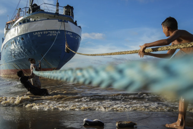 Fëmijët luajnë me litarët e një anijeje të ankoruar në një plazh në Parika, Guajana