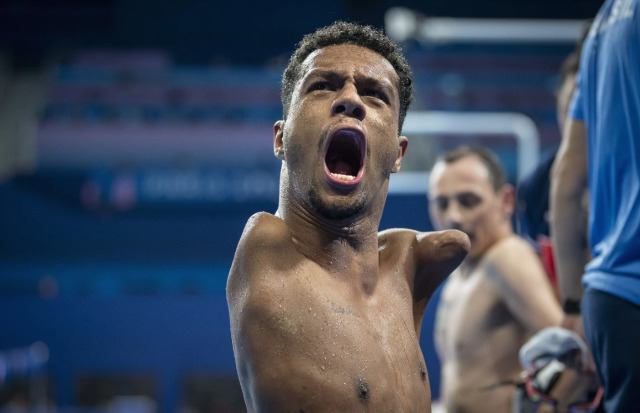Atleti paraolimpik Santos Araujo, nga Brazili, feston pasi fitoi finalen e 200 m stil i lirë – S2 për meshkuj, gjatë Lojërave Paraolimpike 2024 në Paris, Francë