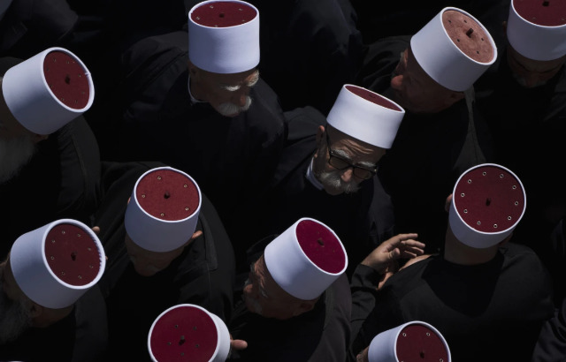 Klerikë druze marrin pjesë në funeralin e disa prej 12 fëmijëve dhe adoleshentëve të vrarë në një sulm me raketa nga grupi militant libanez Hezbollah në një fushë futbolli në fshatin Majdal Shams, në lartësitë e Golanit të aneksuar nga Izraeli