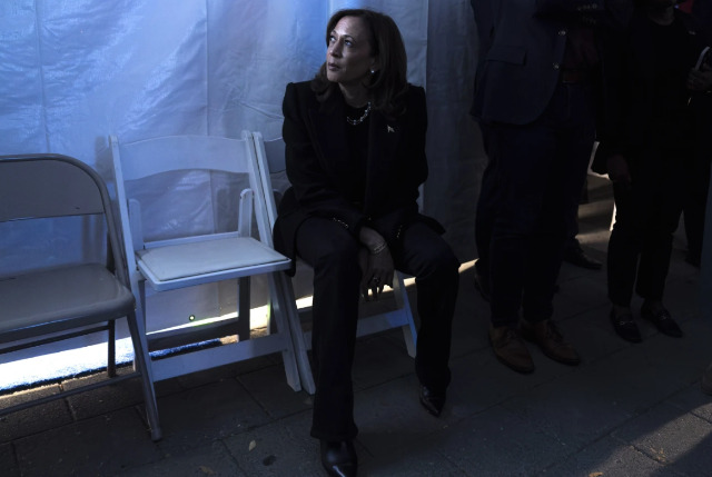 Zëvendëspresidentja e kandidates demokrate për president Kamala Harris shikon një monitor në prapaskenë pak para se të dilte në skenë për tubimin e saj të fundit të fushatës më 4 nëntor 2024, një ditë përpara ditës së zgjedhjeve, në Filadelfia.