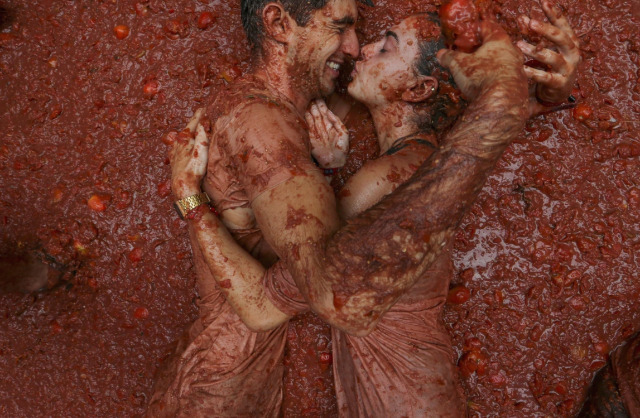 Të dashuruarit shtrihen në një pishinë me domate të shtypura gjatë festës vjetore të luftës së domates “Tomatina”, në fshatin Bunol pranë Valencias, Spanjë