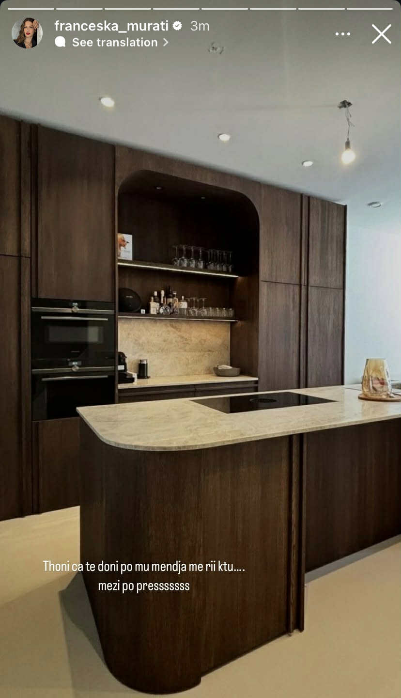 Pak orë më parë, Françeska ka publikuar pamje nga kuzhina, e cila dallohet për stilin modern dhe kombinimin e ngjyrave neutrale, me dominimin e ngjyrës kafe dhe elementëve prej druri.