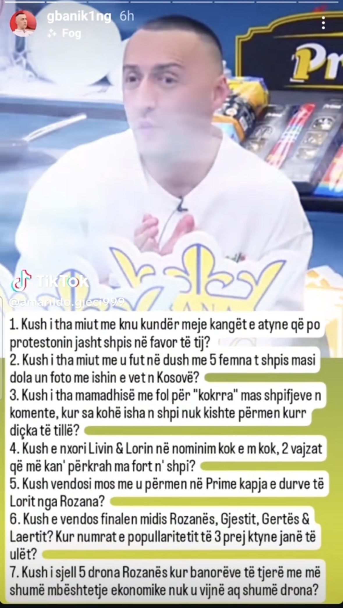 Kush i tha miut me knu kundër meje kangët e atyne që po protestonin jashtë shtëpisë në favor të tij? Kush i tha miut me u fut në dush me 5 femna të shtëpisë masi dola unë foto me ishin e vet në Kosovë? Kush i tha mamadhis me fol për “kokrra” mas shpifjeve në komente, kur sa kohë isha në shtëpi nuk kishte përmen kurrë diçka të tillë? Kush e nxori Livin & Lorin në nominim kokë më kokë, 2 vajzat që më kan’ përkrah ma fortë në shtëpi? Kush vendosi mos me u permen në Prime kapja e durve të Lorit nga Rozana? Kush e vendos finalen midis Rozanës, Gjestit, Gertës & Laertit? Kur numrat e popullaritetit të 3 prej ktyne janë të ulët?-shprehet G Bani.