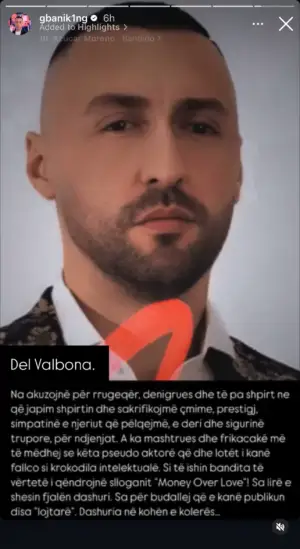 “Del Valbona,” shkruan G Bani në postimin e tij, duke shoqëruar mesazhin me një tekst të gjatë, ku flet për lojën dhe strategjitë brenda formatit. Reperi ka kritikuar ata që, sipas tij, shesin dashurinë dhe ndjenjat për përfitime personale, duke i krahasuar me “aktorë me lot krokodili”.
