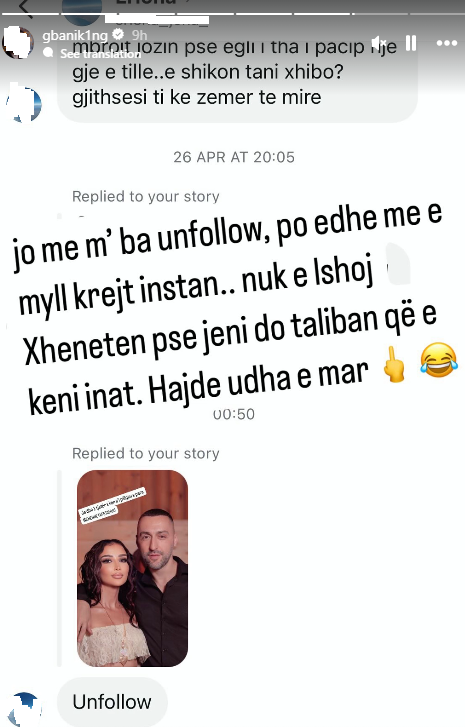 E reperi nga Shqipëria tha: “Jo me më bë unfollow, po edhe më mbyll krejt Instagramin, nuk e lëshoj Xhenetën pse jeni disa talibanë që e keni inat. Hajde udha e mbarë”.
