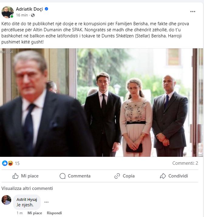 Gazetari Adriatik Doçi paralajmëron se këto ditë do të publikohet një dosje e re korrupsioni për familjen Berisha.