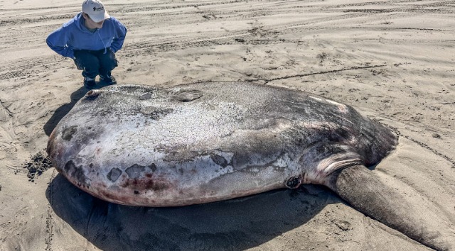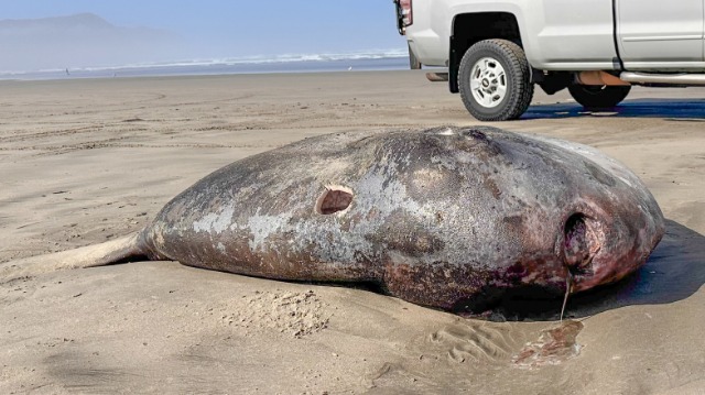 Peshku ‘diellor kapuç’ u pa nga pushuesit në plazhin e Origonit kapte një gjatësi 2 metra, me një trup të rrumbullakët, pendë të mëdha dhe sy të fryrë u shpërtheu përgjatë bregut të Oregon.