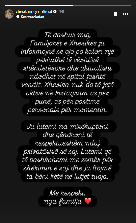 Ata kanë kërkuar mirëkuptimin e ndjekësve për të respektuar privatësinë e saj në këto momente, duke ftuar të gjithë dashamirësit që t’i bashkohen lutjeve për një shërim sa më të shpejtë.