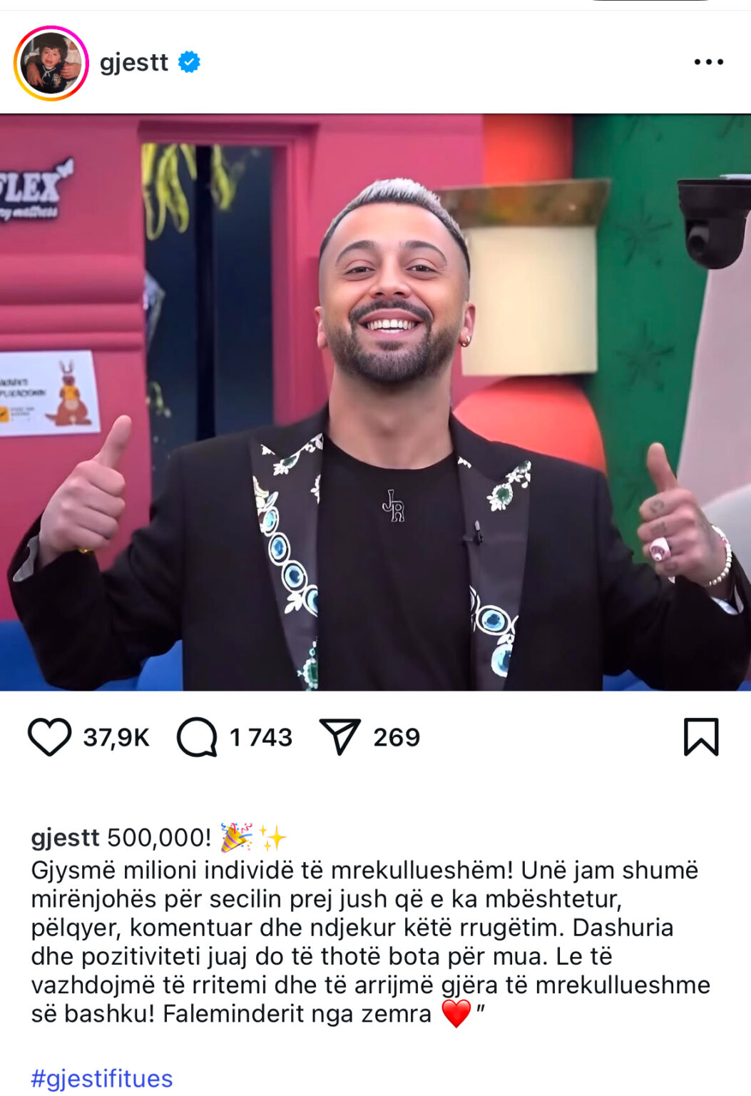 ”Gjysmë milioni individë të mrekullueshëm! Unë jam shumë mirënjohës për secilin prej jush që e ka mbështetur, pëlqyet komentuar dhe ndjekur këtë rrugëtim. Dashuria dhe pozitiviteti juaj do të thotë bota për mua. Le të vazhdojmë të rritemi dhe të arrijmë gjëra të mrekullueshme së bashku! Faleminderit nga zemra”, shkruan në postimin falënderues në profilin e Gjestit.