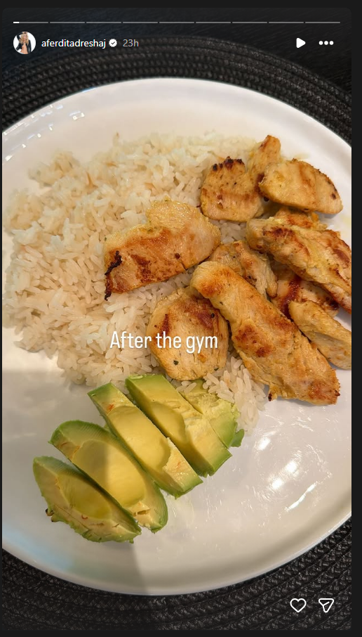 Në Instastory ka ndarë rutinën duke zbuluar se çka konsumon pas fitnesit.