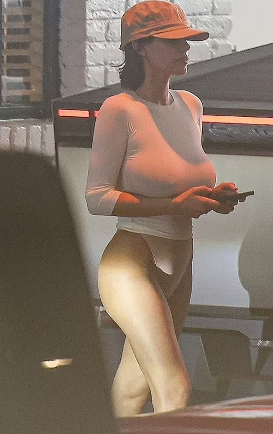 Bianca Censori mbante të veshur thjesht një bluze dhe të brendshme, po ashtu taka të zeza.