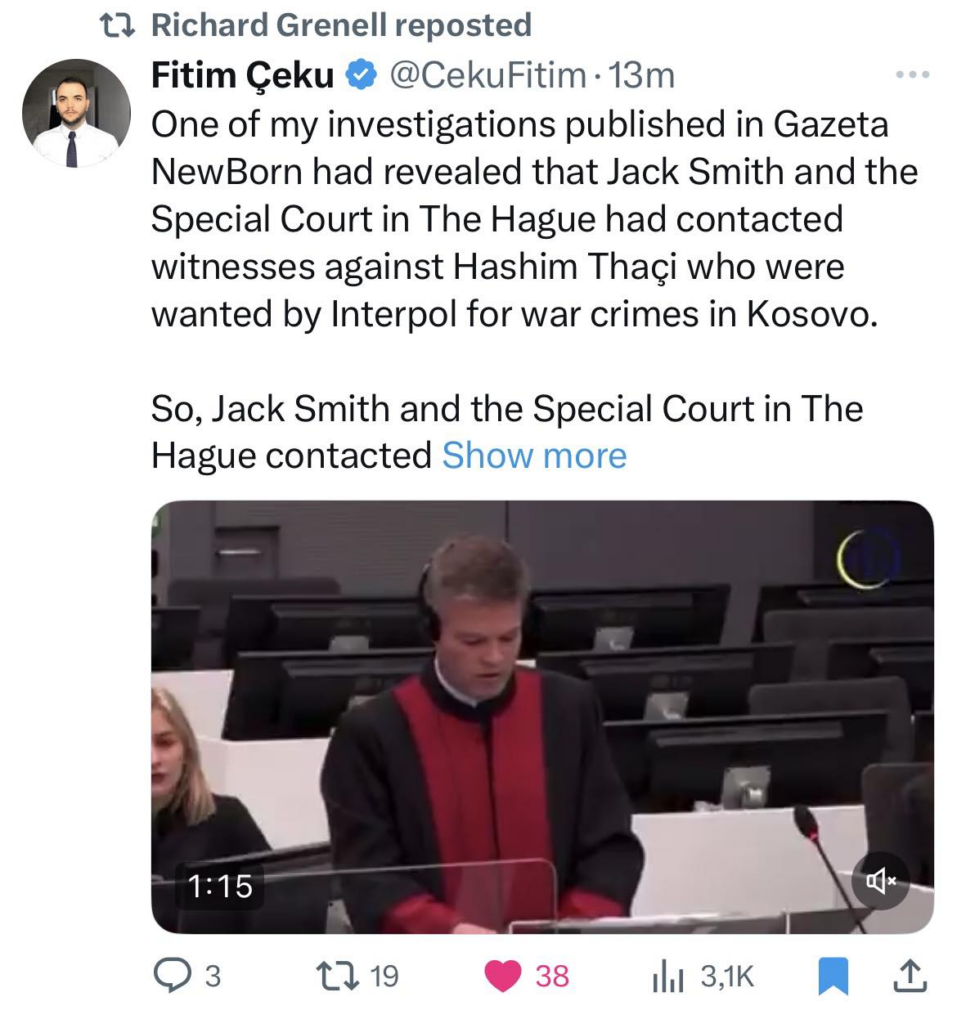 Ish-emisari amerikan për dialogun Kosovë-Serbi, Richard Grenell, ka reaguar në rrjetin social X, duke shpërndarë një postim që hedh akuza ndaj Gjykatës Speciale në Hagë dhe kryeprokurorit Jack Smith në lidhje me arrestimin e ish-presidentit të Kosovës, Hashim Thaçi.