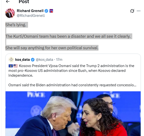 “Ajo po gënjen.Ekipi Kurti/Osmani ka qenë një katastrofë dhe të gjithë e shohim qartë këtë. Ajo do të thotë gjithçka për mbijetesën e saj politike”, ka shkruar Grenell.