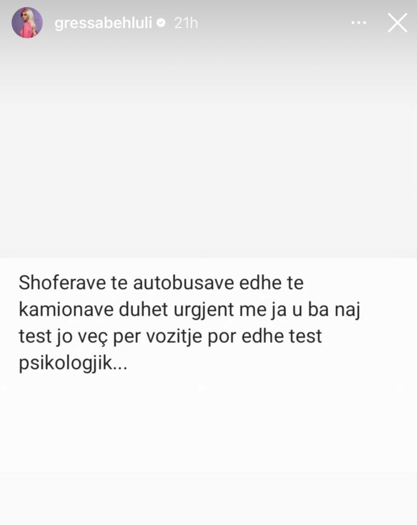 Përmes një “story” në Instagram, Behluli ka theksuar se shoferët e autobusëve dhe kamionëve duhet t’i nënshtrohen urgjentisht jo vetëm testit të vozitjes, por edhe testit psikologjik.